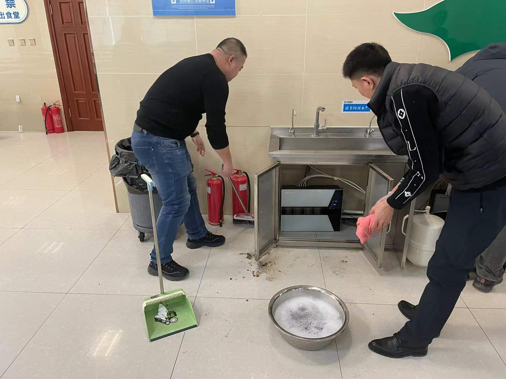 此次清扫将平时不太注意的死角、盲区作为重点清洁区域,主要对热水器、洗手池等部位进行全面清理,并用钢丝球仔细清除每一处顽固污渍。同时,对食堂操作间、用餐区进行全面清扫,确保无卫生死角;规范摆放各种设备、工具,做到清洁整齐。