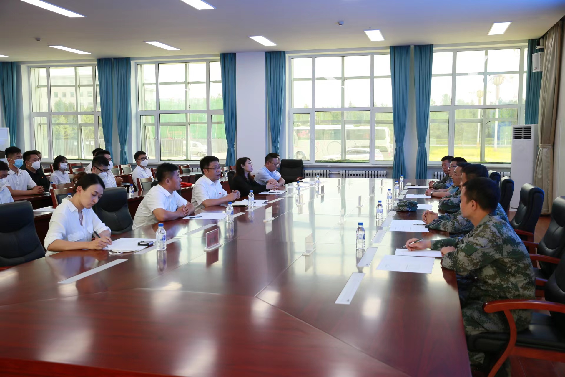 随后在教学楼举行军地领导座谈交流。会上张胜利政委表示:希望军地双方携起手来,共同把习近平总书记殷殷嘱托转化为实际行动,为强军兴军、吉林发展作出更大贡献。陆军装甲兵学院士官学校创建传承历史悠久、办学治校能力不断提升,源源不断为部队输送了一批又一批装甲兵人才。同时积极参与地方经济社会发展,主动承担脱贫攻坚、生态建设、抢险救灾、重大工程等重要任务。展现了优良作风和顽强意志,充分体现了军民鱼水情谊。今后我们将继续发扬光荣传统,视吉林为家乡、视百姓为亲人,主动融入吉林发展,为全面振兴全方位振兴保驾护航。傅强同志表示:我们一定要持续深化双拥共建工作,这是电竞博彩 集团第一次与部队开展这么深入的联动共建工作,希望我们继续保持深入交流,请贵部队能到项目现场参观指导,将军队作风代入到电竞博彩 集团。作为城建铁军,我们也秉承着部队不怕苦、不怕累的优良作风,希望我们能不断巩固同呼吸、共命运、心连心的军政军民关系。