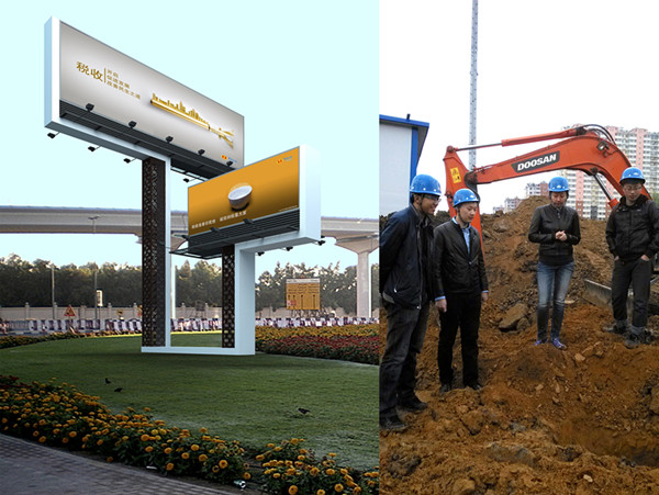 图说:亚泰大街与卫星路交会户外广告牌效果图(左)本公司员工在施工现场(右)